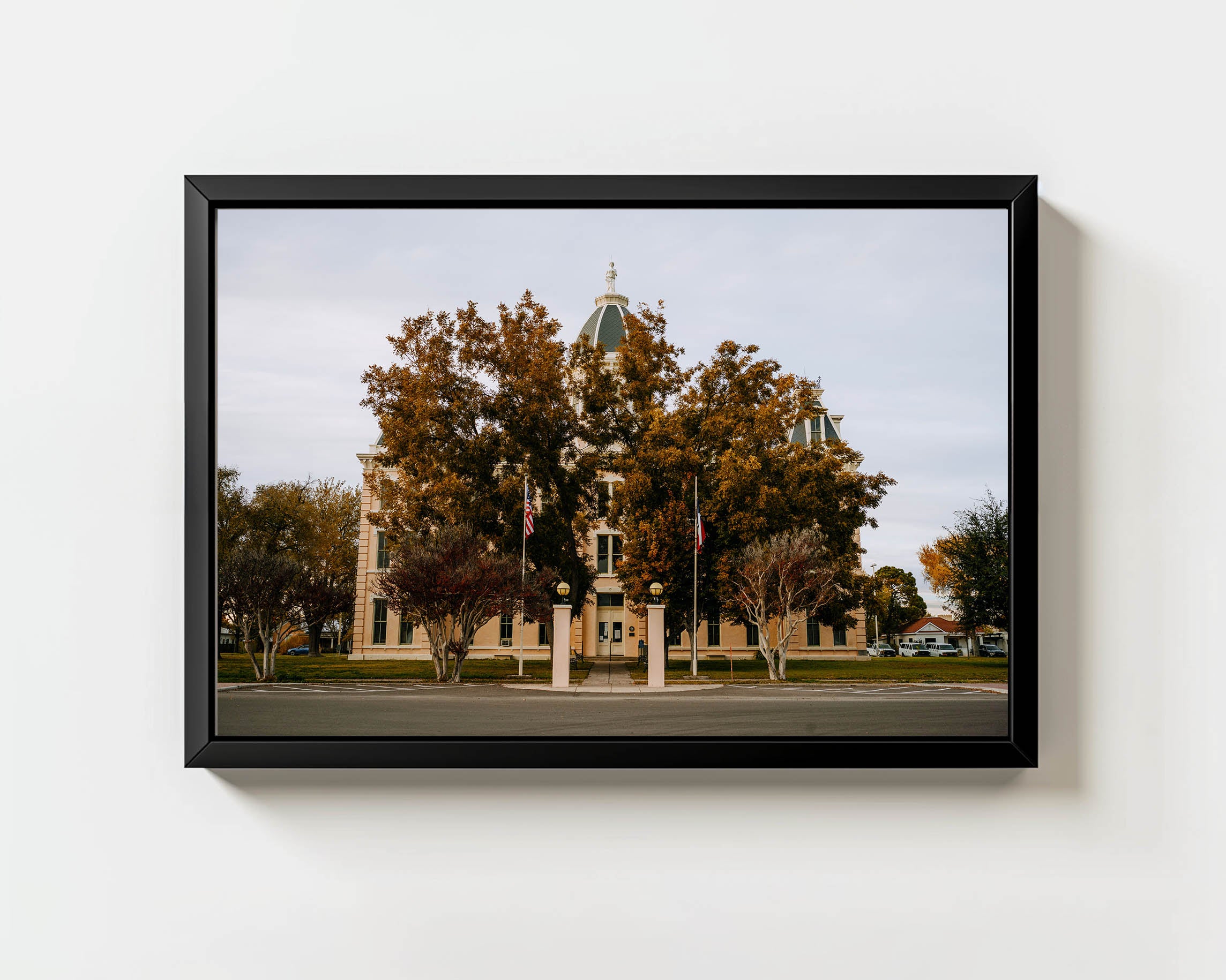 This photograph captures the Presidio County Courthouse in Marfa, Texas, but this time, nature takes center stage. The autumn trees stand tall, partially obscuring the building, creating a balance between history and the ever changing seasons. The courthouse remains steadfast, a pillar of Marfa’s heritage, yet the shifting colors of the trees remind us that nothing stays the same forever.