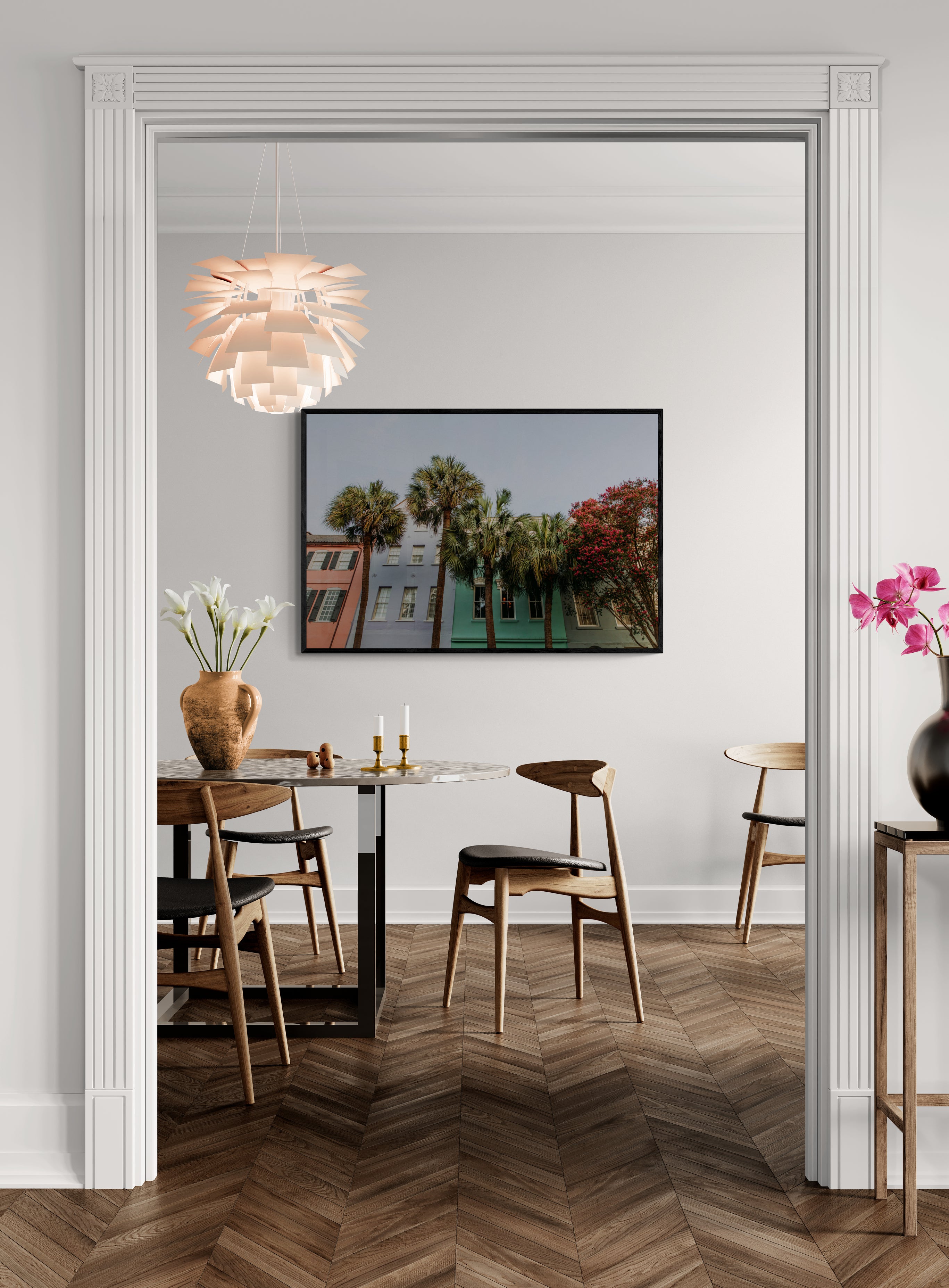 Charleston has a way of layering beauty. Pastel facades, towering palms, blooms that frame the streets like brushstrokes on a canvas. This scene felt like harmony to me, a perfect composition of color, movement, and light. The palm trees stand tall, stretching toward the sky, rooted in history but forever growing.