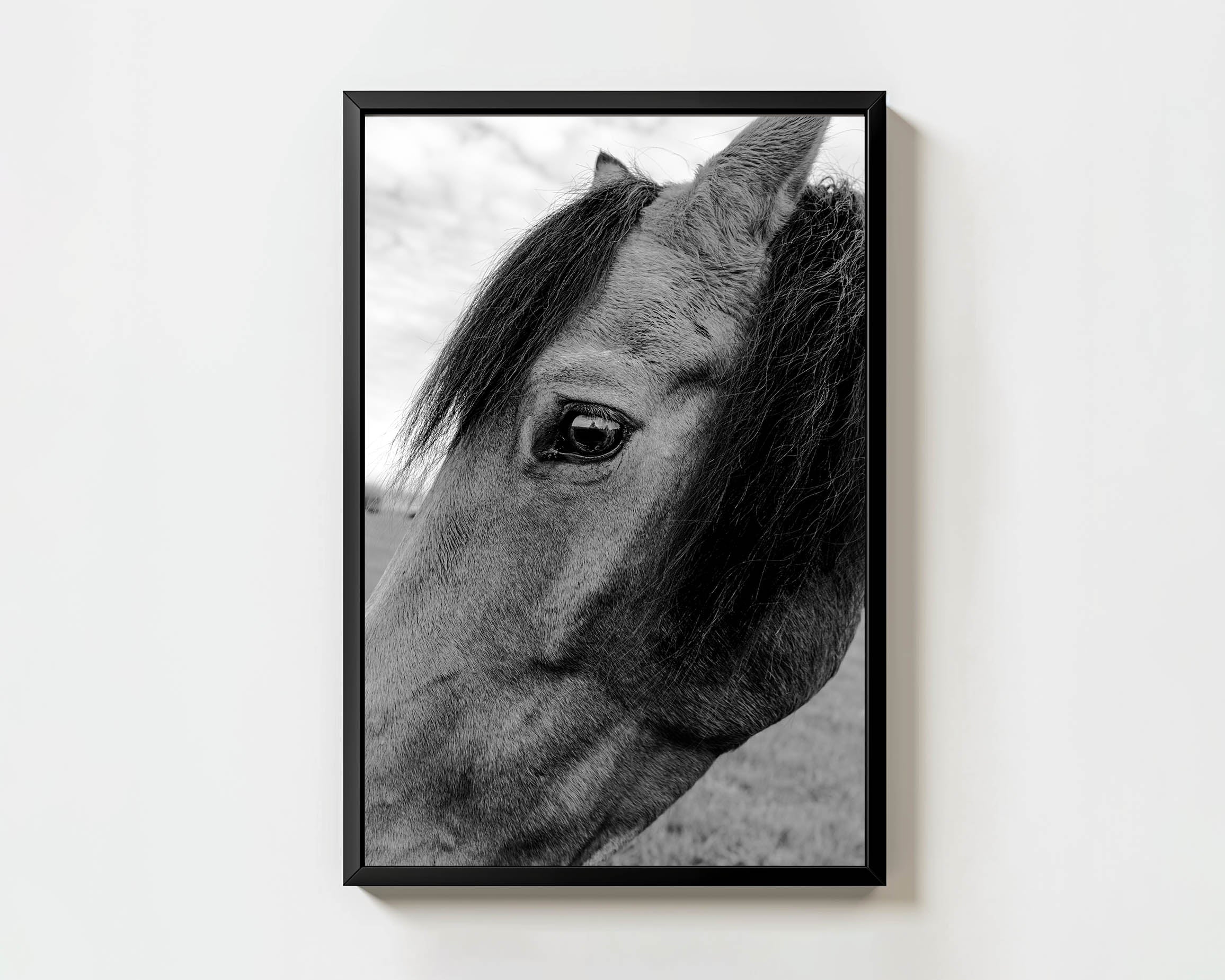In this close-up, the horse’s gaze is direct and powerful, pulling you into its world. The black and white image enhances the depth in its eyes, where the untamed spirit of the wild shines through. There is a quiet strength in this moment, a silent understanding between animal and nature. The simplicity of the photo speaks volumes, letting the horse’s gaze tell its own story. A story of freedom, grace, and the untold bond between the land and its creatures.