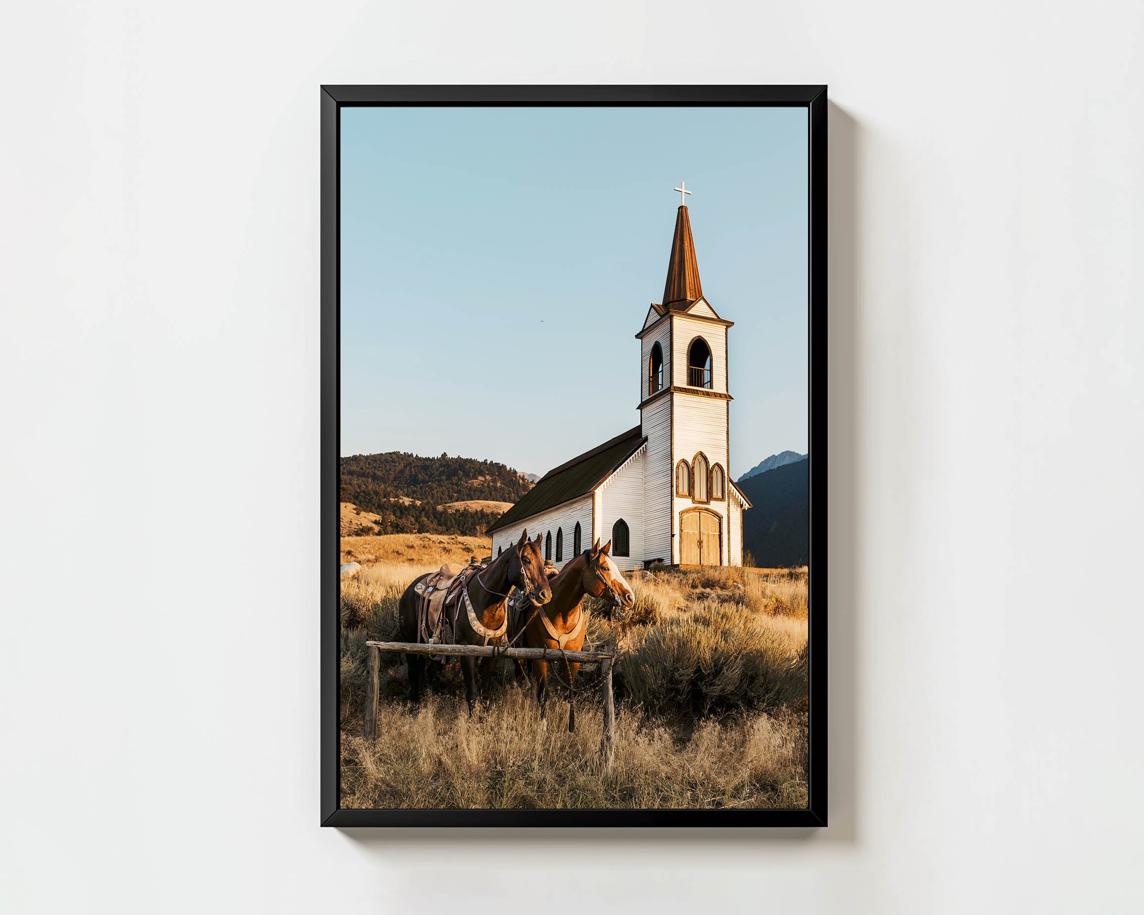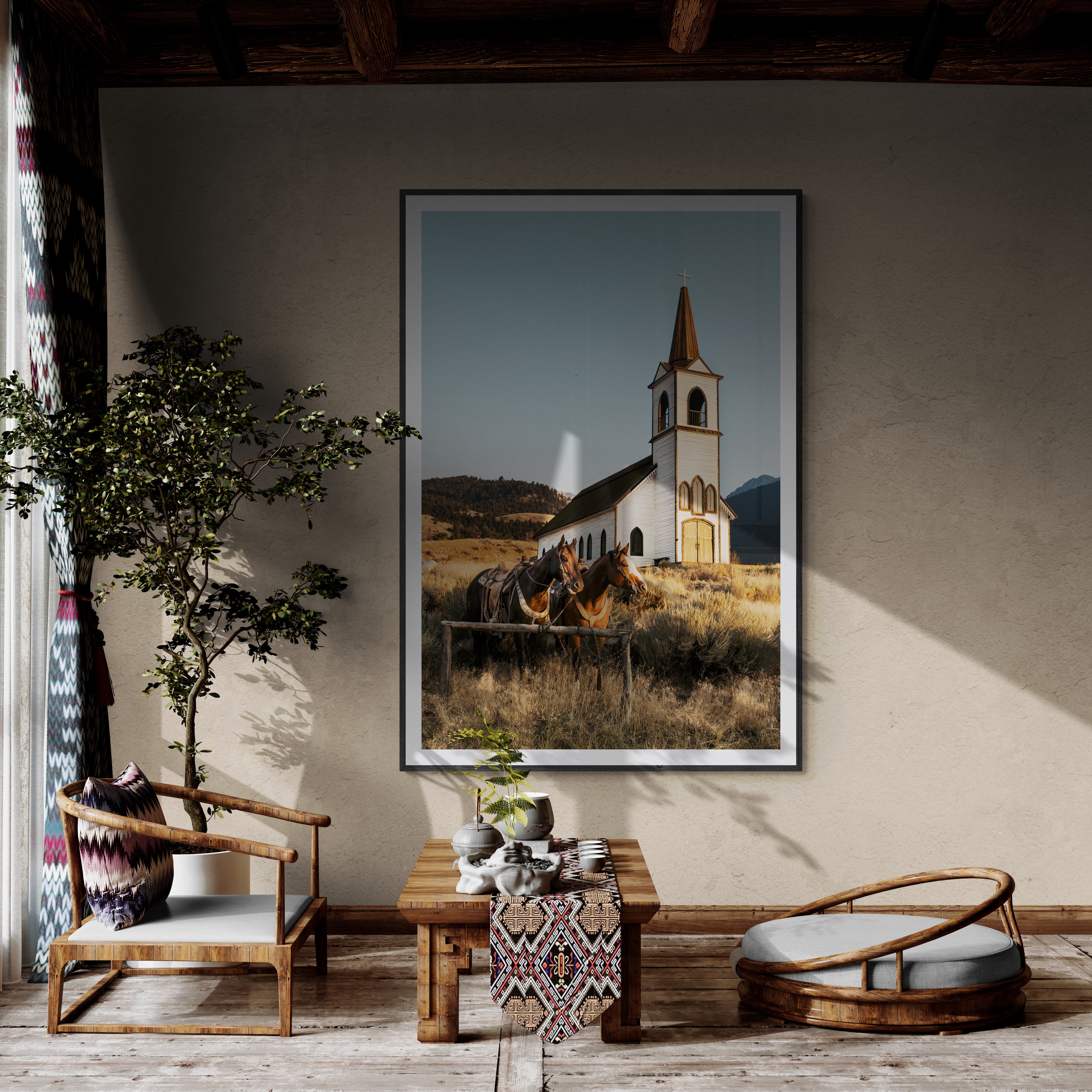 A relic of the Old West, this weathered chapel stands as a testament to Montana’s untamed spirit, a place where history and frontier grit once intertwined beneath vast open skies. The golden hour light spills across the rugged landscape, illuminating the worn wood and casting long shadows over the sagebrush. Two saddled horses wait patiently at the hitching post, their presence echoing the rhythm of an earlier time when riders stopped to rest, regroup, and move on. The distant mountains stand watch, silent witnesses to the passage of time, as this space remains rooted in the wild enduring heart of the American West.