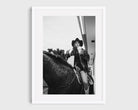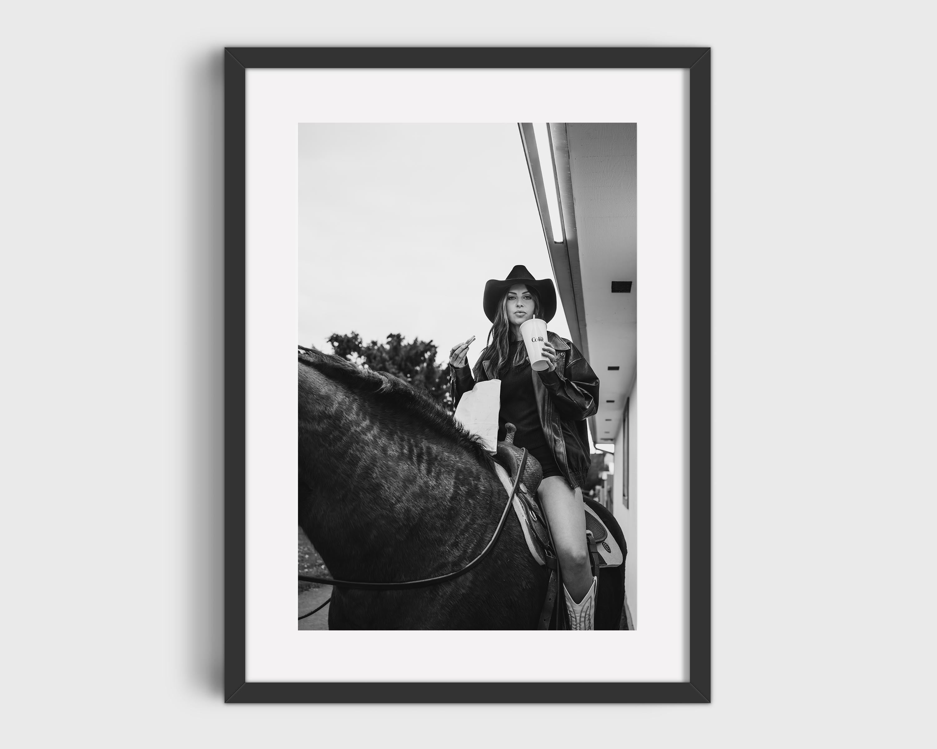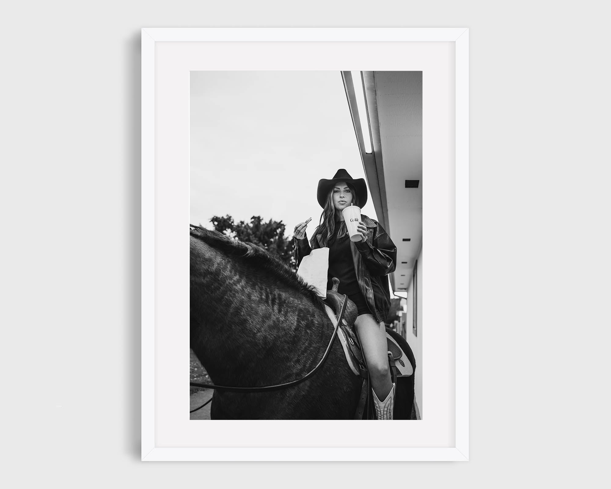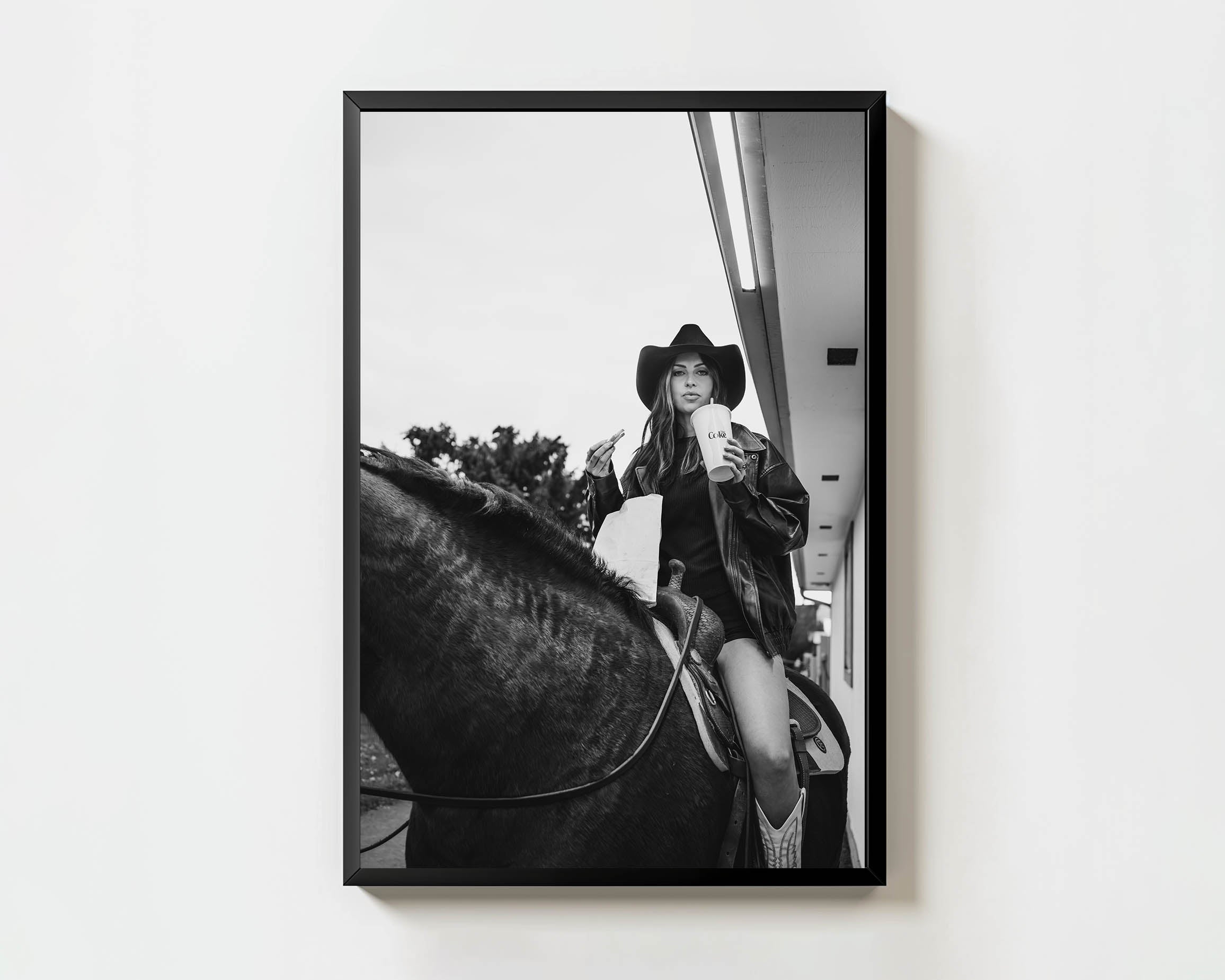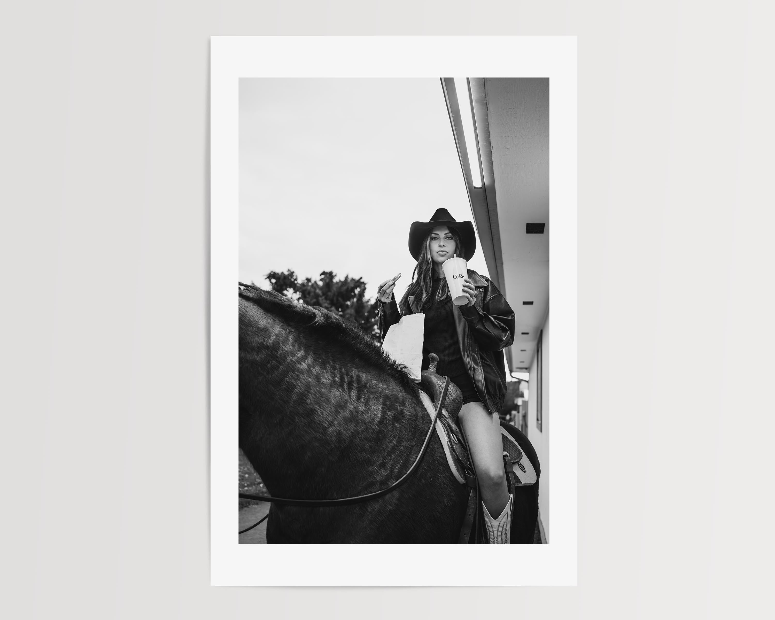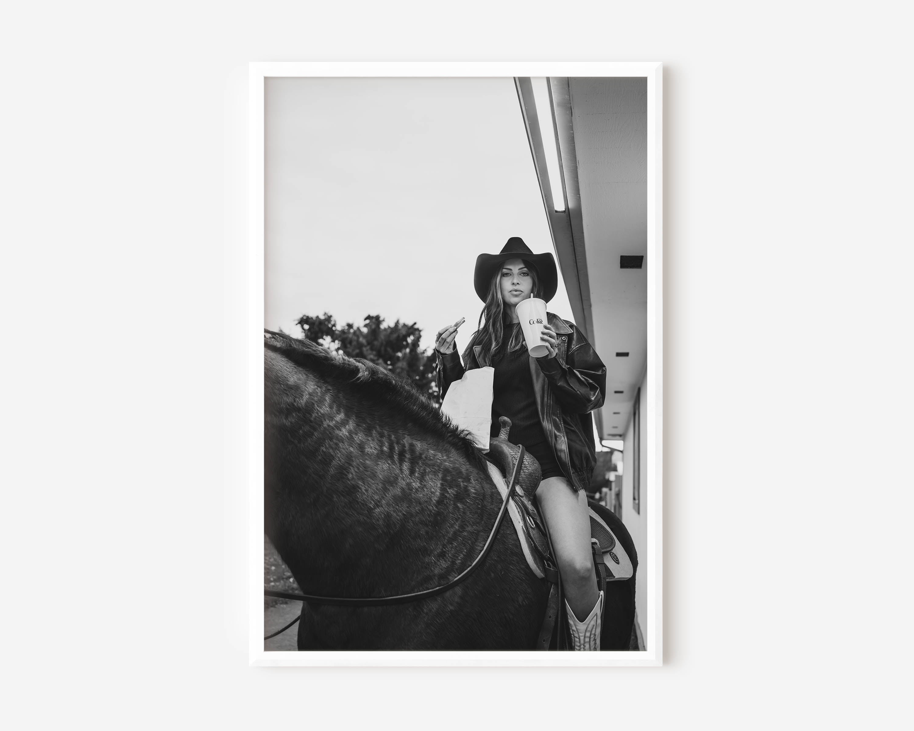 Americana, West is western life, no rush required. A cowgirl on horseback, soda and fries in hand, making an everyday moment feel iconic without trying.